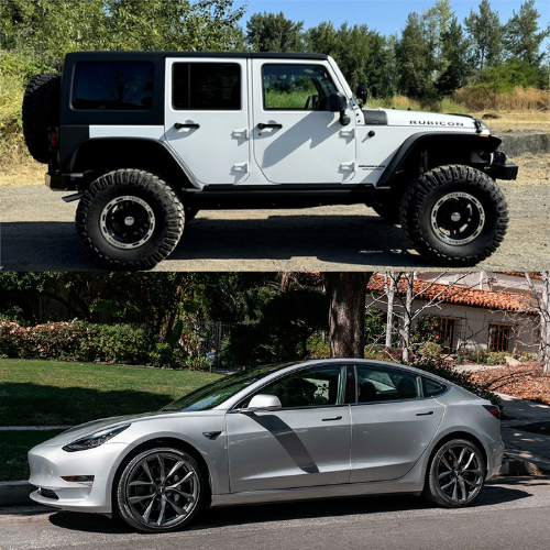 - Operating or associated with two vehicles: a gray Tesla sedan and a white Jeep Wrangler, both bearing Florida plates